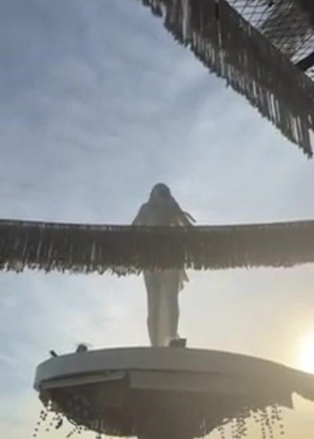 woman standing on a raised platform, backlit by a bright sun and cloudy sky. She is wearing a long white dress or robe. The platform is circular and appears to be part of a decorative structure, with hanging fringe elements around it. The camera angle is from below, looking up at the woman and the structure. The ocean can be seen on the left. The lighting emphasizes the silhouette of the woman. The music has a strong, rhythmic beat.
