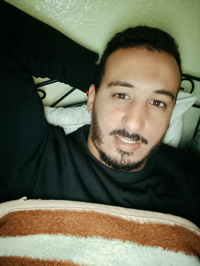 A male individual is depicted in a close-up indoor shot, positioned vertically in the frame from the chest up. He has dark, short curly hair, a beard, and a mustache, with light brown eyes. He is looking directly at the camera with a slight smile, revealing his upper teeth. He is wearing a dark-colored, long-sleeved garment, likely a sweater, with a visible ribbed texture. He is lying down, with his head resting on a white pillow. His right arm (viewer's left) is raised, bent at the elbow, and positioned behind his head or out of view. A blanket with horizontal stripes of brown/tan and off-white textured material covers his lower chest and torso. Behind his head, a portion of a dark metal headboard with decorative scrollwork is visible. The wall behind him is a light green or off-white color with a textured finish. The specific location within the city of Meknes, Morocco, cannot be determined from the visual evidence in the image.