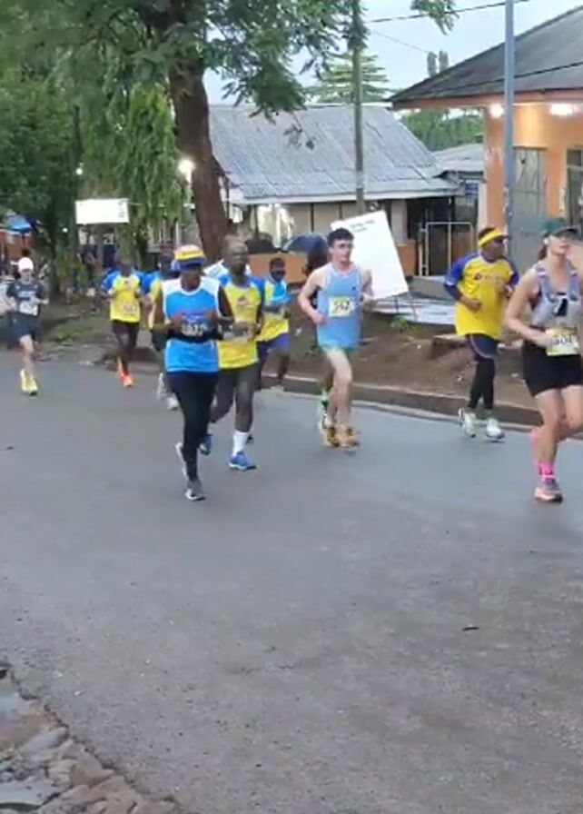 group of people running on a paved street. The runners are of various ages and ethnicities, and they are wearing different athletic clothing. Some runners wear yellow and blue shirts while others wear black. The street is lined with trees and buildings. The sky is overcast. The runners are participating in a marathon, as bib numbers are visible on some.