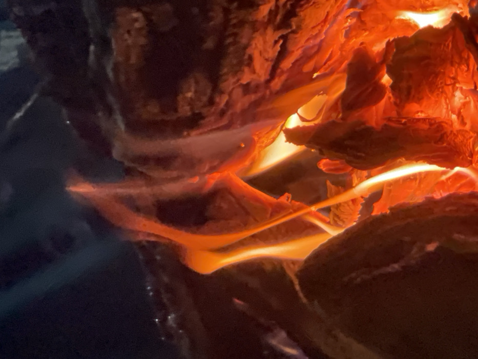 A close-up captures burning logs with intense red and orange flames