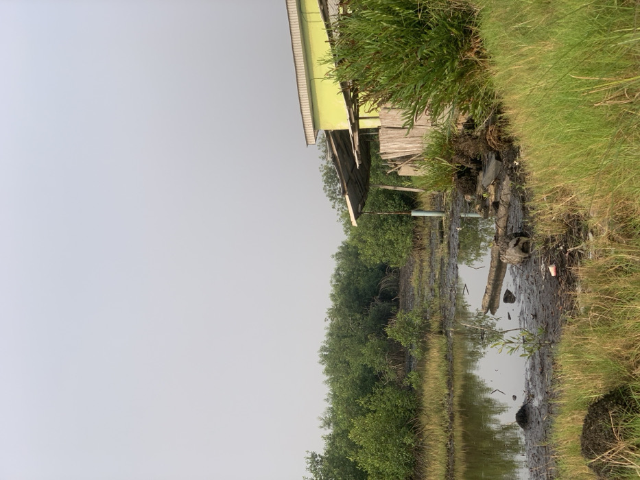 This image depicts a marshy, undeveloped area in Ibasa, Nigeria, under an overcast sky