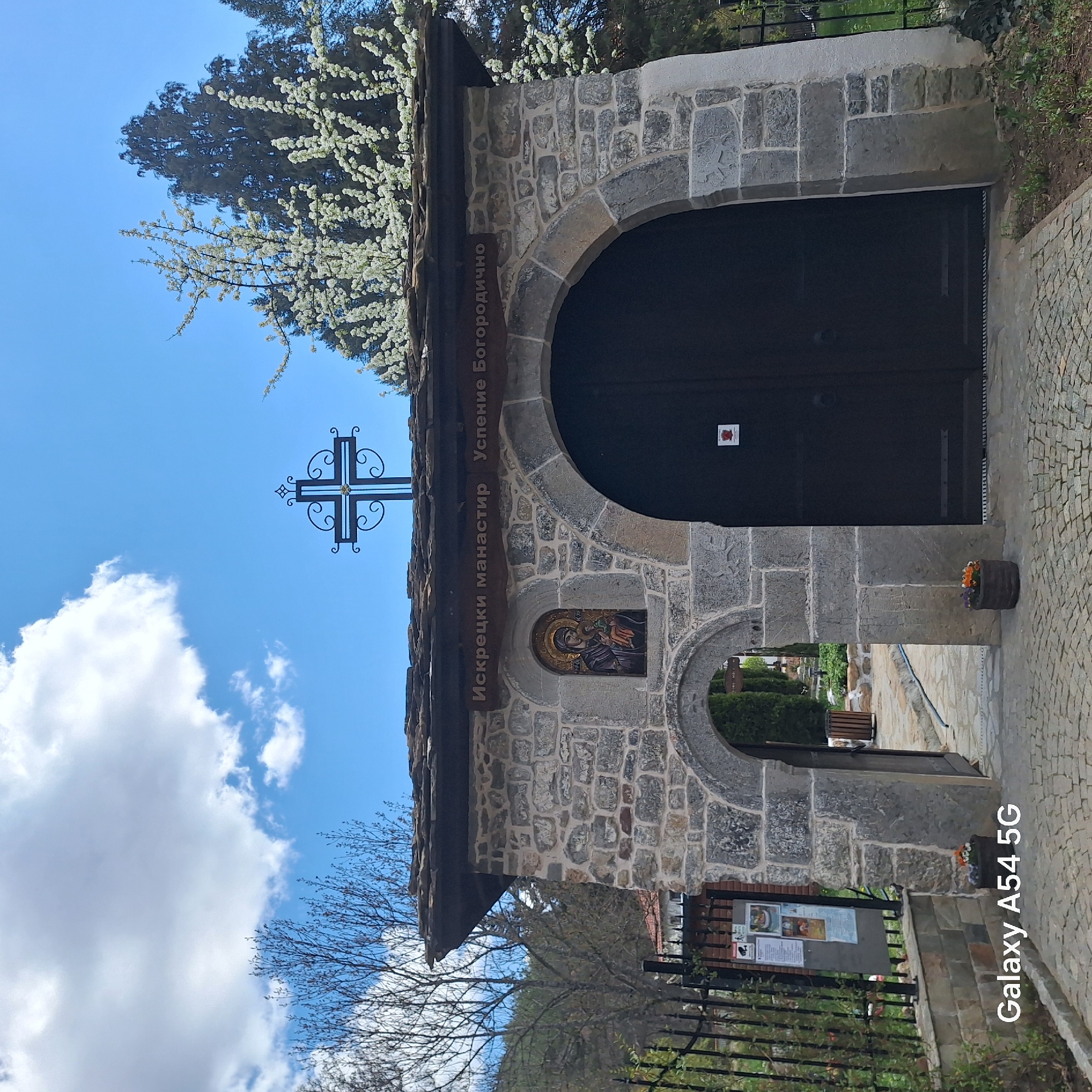 entrance to the Iskrets Monastery "Assumption of the Mother of God," located in the village of Iskrets, Bulgaria. The entrance is made of stone, with a large wooden door under a stone arch. Above the door, there is a smaller arched opening. A metal cross stands on the side, and signage with Cyrillic script is mounted on the stone facade. The sky is visible with clouds and flowering trees in the background. A cobbled path leads into the monastery grounds. A Samsung Galaxy A54 5G watermark is in the lower right corner.
