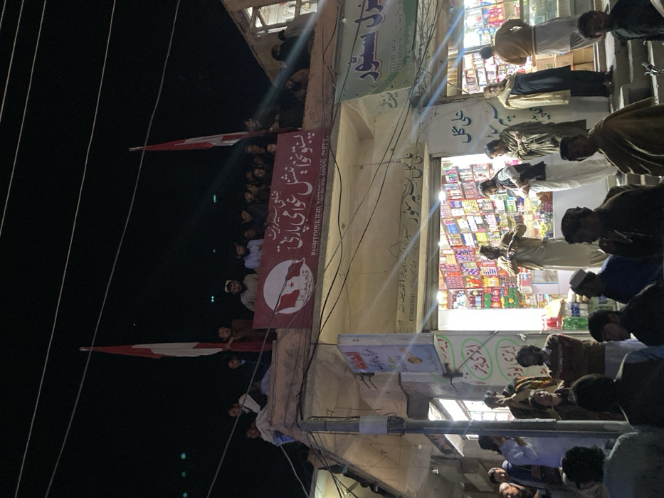 At night in Qilla Saifullah, Pakistan, a public gathering is depicted around a two-story building