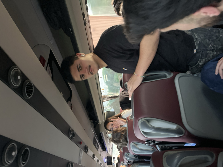The image depicts the interior of a passenger coach or bus. The location within the city of Leiria, Portugal, cannot be definitively determined from the visual evidence. In the mid-ground, a young male stands facing the camera, positioned slightly right of center. He has dark hair, a mustache, and is wearing a black t-shirt with a small colorful logo on the left chest, and dark patterned trousers. White earbuds are visible in both ears. His right hand rests on the upper part of a burgundy and grey bus seat. He wears a light-colored beaded bracelet on his left wrist. He looks directly at the camera with a neutral expression. Behind this male, to the left, a young female with dark hair and glasses is seated, looking towards the camera. Her right hand is raised, palm facing the camera, in what appears to be a gesture to stop or block the image capture. She is wearing a light-colored top. In the immediate foreground, the back of a person's head and shoulder with dark hair is visible on the right, facing away from the camera. The bus interior features rows of burgundy and grey seats. Overhead, white panels contain air vents, reading lights, and luggage compartments. Windows along the right side of the bus reveal blurred green foliage and indistinct structures outside, suggesting movement or a stop in an area with vegetation. Other passengers are partially visible further down the aisle, mostly obscured by seats or other individuals. A small monitor screen is visible in the upper left background.