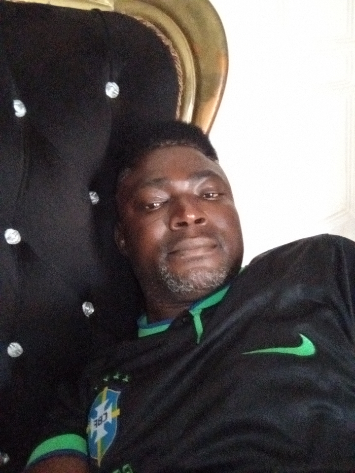 An adult male is depicted in an indoor setting, City of Unknown, Unknown. He is seated, positioned with his torso slightly angled and his head directed towards the camera. The male has a dark complexion, short dark hair, and a salt-and-pepper goatee. He wears a black, short-sleeved collared shirt with green trim, featuring a bright green Nike swoosh logo on the right chest and a CBF (Confederação Brasileira de Futebol) emblem with four green stars above it on the left chest. He is seated in a dark-colored, likely black, upholstered armchair. The chair exhibits tufting with visible decorative, possibly crystal-like, buttons and features a prominent gold-colored frame or armrest detail on the upper left side of the image. A plain, light-colored wall constitutes the background on the right side. The subject maintains a neutral to slightly content expression while looking directly at the camera.