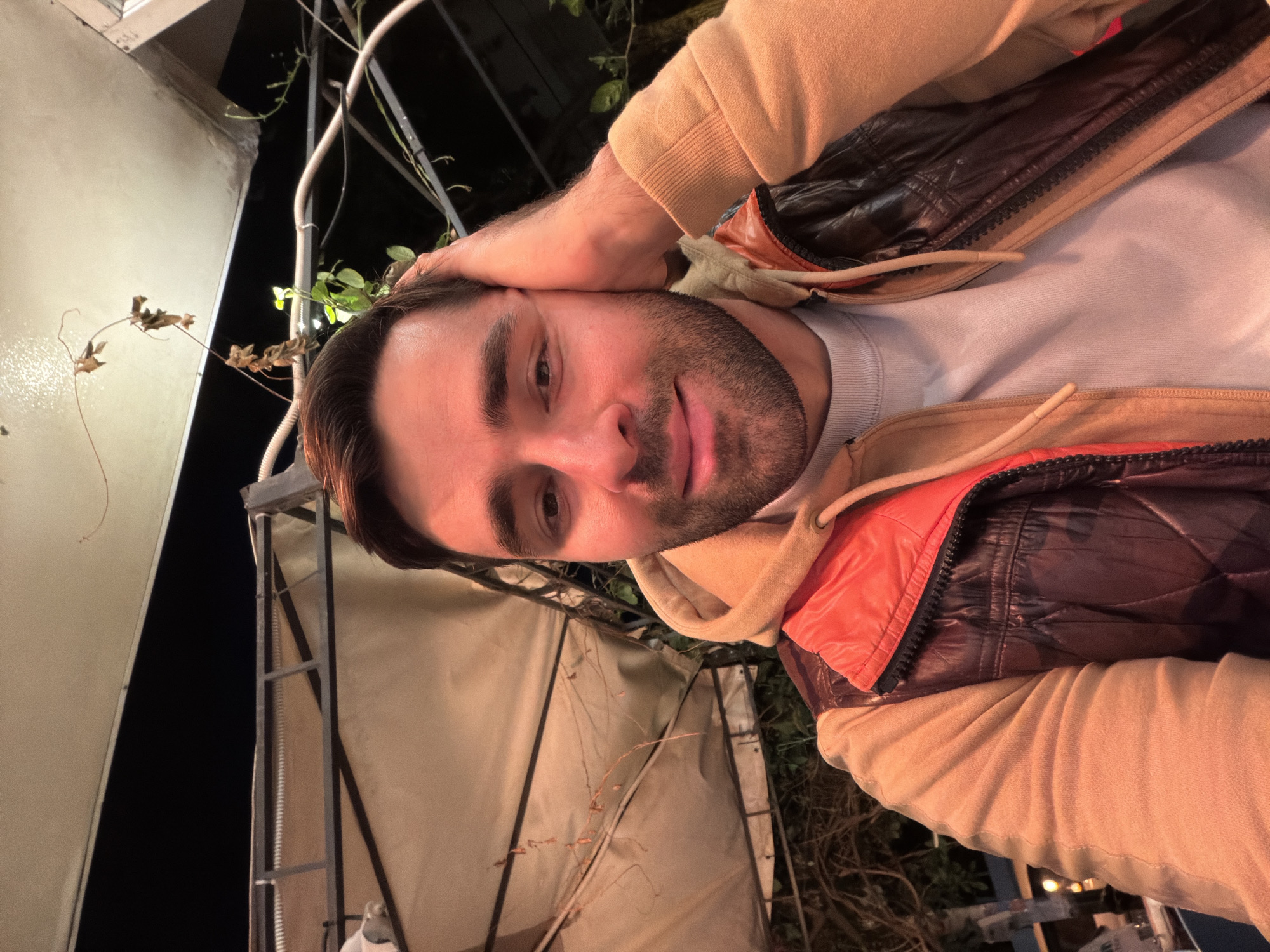 The image displays a close-up, eye-level view of a male subject, estimated to be between 25 and 35 years old, in an outdoor, nighttime setting. The subject has short, dark hair and a trimmed beard, looking directly at the camera with a slight smile. He is wearing a light grey or white crew-neck shirt, layered with a tan hooded sweatshirt, and an open dark brown quilted vest featuring an orange interior lining or collar detail. His left hand is raised, with fingers resting against the side of his head near the temple. The background is dimly lit by warm artificial light, highlighting an overhead light-colored fabric canopy or awning supported by a dark metal framework. Sparse, trellised vegetation, including some dried vines and a few green leaves, is visible clinging to the overhead structure. The overall environment suggests a patio or outdoor dining area. Specific identifying landmarks or features to pinpoint the location within the city of Al Jizah, Jordan, are not discernible from the provided visual information.