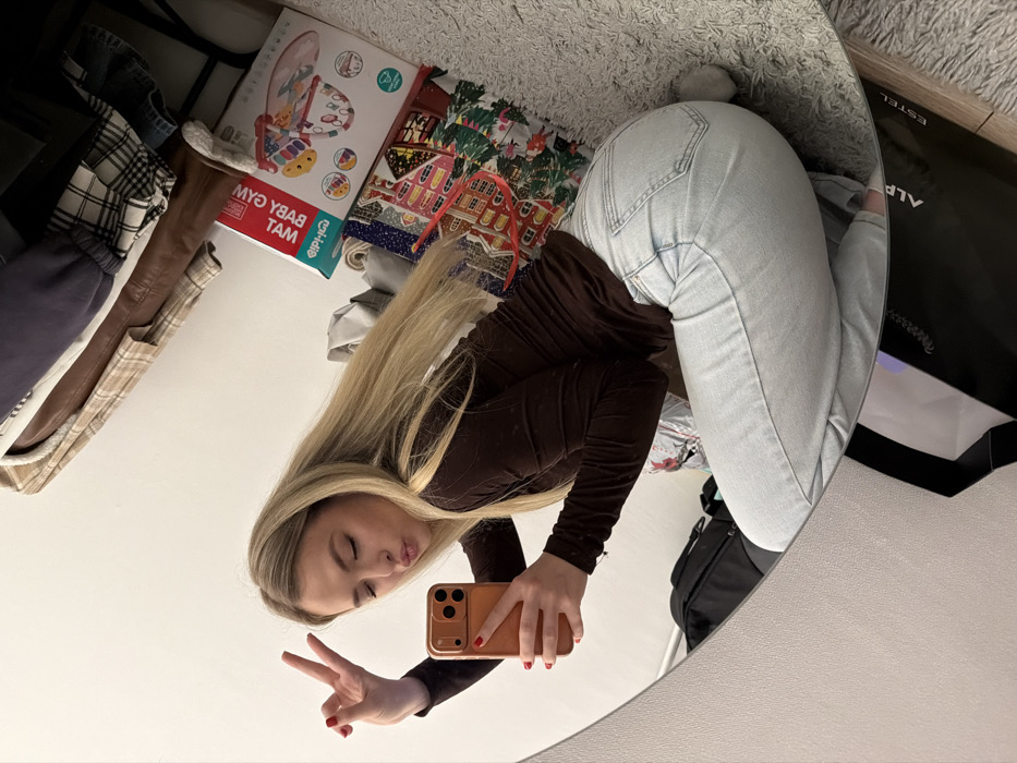 A woman poses in front of a round mirror, giving a peace sign with her left hand while holding a phone in her right. She has long blonde hair, light skin, and wears a dark brown long-sleeved shirt and light blue jeans. The background shows cluttered items like boxes (one labeled "Baby Gym Mat"), clothes, and a black bag. The setting appears to be a room with a carpeted floor.