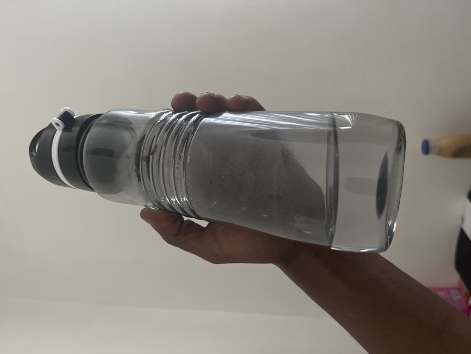 A hand holds a grey, rectangular water bottle horizontally against an off-white background. The bottle has a black lid with a white loop attached. The liquid inside the bottle appears murky. The hand is dark-skinned, and part of the forearm is visible. In the blurred background, a blue cap of another bottle is visible, along with a partial view of a white object and a pink surface.
