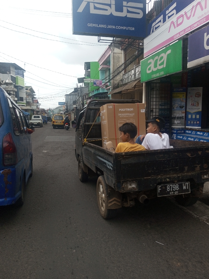 The image displays a bustling urban street scene in the city of Kalchini, India, under an overcast sky. In the foreground, a dark-colored pickup truck is positioned towards the right, its bed loaded with a large, light-brown Polytron-branded cardboard box secured by yellow ropes. Two young males are seated in the truck bed, one wearing a yellow t-shirt and the other a white t-shirt and a dark baseball cap, both looking forward. The truck's rear license plate reads 'F 8798 WT' with '07-21' indicated below. To the left, the rear section of a blue van is partially visible, showing signs of wear. The street recedes into the background, showing other vehicles including a white van, a yellow car, and a motorcycle. Buildings with commercial storefronts line both sides of the road. Prominent overhead signage above the pickup includes a blue sign for 'ASUS GEMILANG JAYA COMPUTER' and a green sign for 'acer GEMILANG JAYA'. Numerous overhead electrical wires are visible throughout the upper frame.