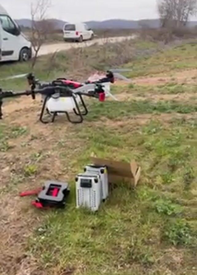 A man stands beside a large agricultural drone, and someone is looking at a handheld device, probably controlling the drone. The drone is equipped with a tank, presumably for spraying crops. Nearby, there are batteries and some other equipment. The man is wearing a black jacket with "EA7 EMPORIO ARMANI" on the chest and a "BOSS" shirt underneath. A survey pole is set up in a field. The sky is overcast and there are two white vans parked in the background. The video is likely about agricultural spraying using drone technology.
