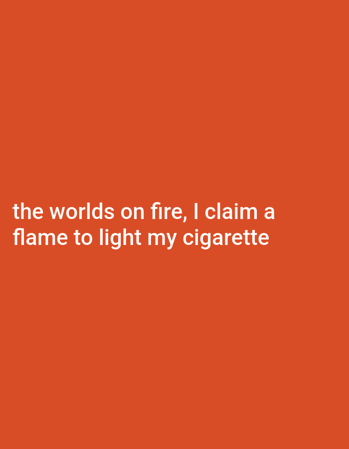 The image displays a solid, monochromatic orange background. Positioned in the lower half of the frame, white sans-serif text reads: "the worlds on fire, I claim a flame to light my cigarette". No people, physical objects (other than the text), actions, or a discernible environment are depicted, thus precluding identification of any specific location within Cape Town, South Africa, or elsewhere.
