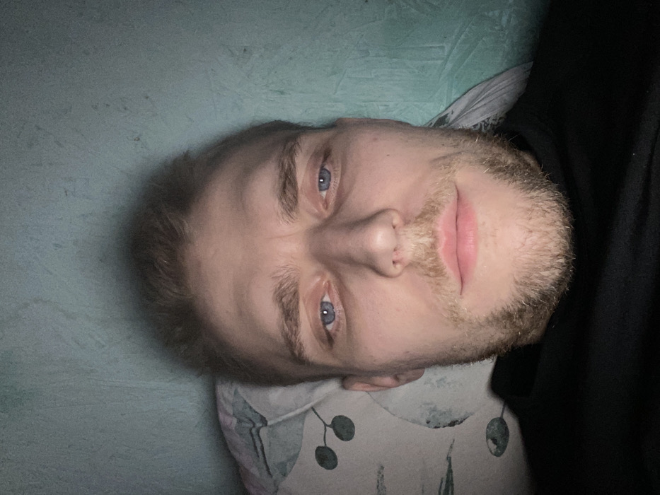 A close-up portrait of a fair-skinned man with blue eyes and a light brown beard. He is lying down, angled towards the camera. His hair is short and light brown. He has a slight mustache and a light stubble on his cheeks and chin. A pillow with a patterned design is visible beneath his head. The background is a pale blue-green wall on one side and a dark, blurred area, possibly clothing, on the other.