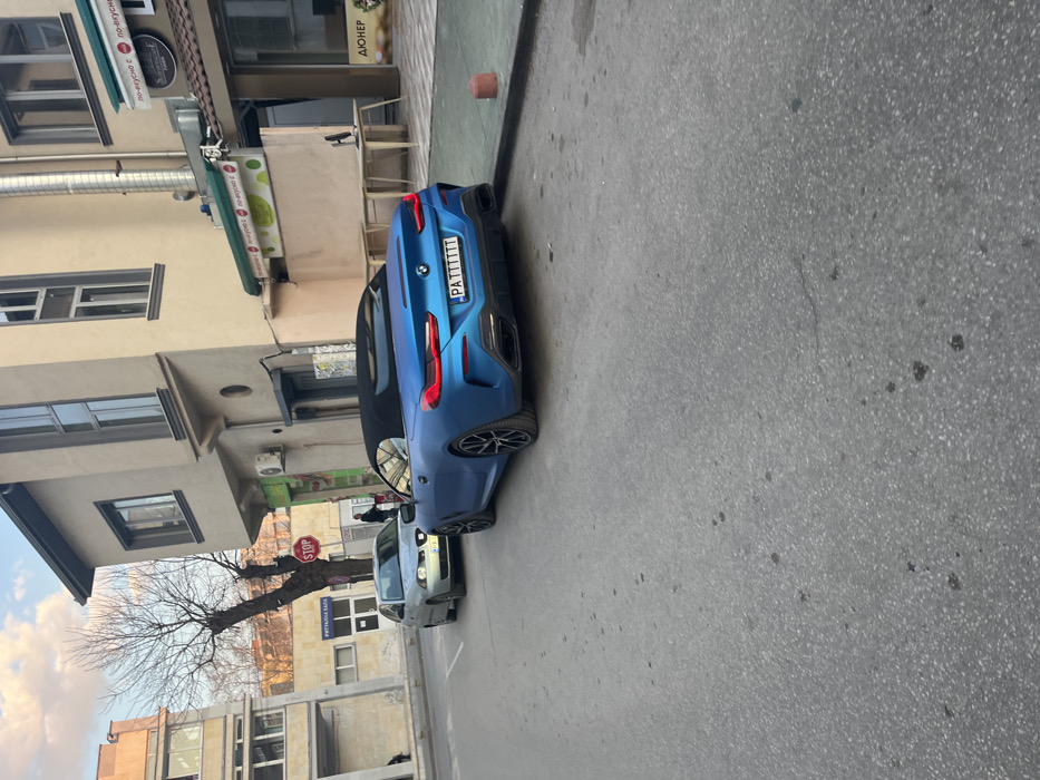 The image captures an urban street scene in Pazardzhik, Bulgaria, observed under natural daylight conditions, suggesting late afternoon or early morning. The foreground consists of a grey asphalt street showing minor cracks and dark stains. Prominently featured in the mid-ground is a matte blue convertible BMW (model likely 8 Series G14) with a black soft-top roof in a closed position. The vehicle is parked on the right side of the street, oriented away from the camera, with its rear visible. The Bulgarian license plate reads "PA111111", confirming the Pazardzhik registration region. The BMW is partially positioned on the asphalt and partially on an adjacent paved area. A red cylindrical bollard is situated on the curb near the vehicle's rear right wheel. To the immediate right of the BMW is a multi-story building with a light beige stucco facade and dark-framed windows. The ground floor houses a commercial establishment with a green awning. Visible signage in Bulgarian includes "ДЮНЕР" (Doner) and "ПО-ВКУСНО С" (More delicious with), indicating a food vendor. Two light-colored wooden picnic-style tables with benches are arranged outside this establishment, extending into the paved area. A vertical metal exhaust duct runs up the building's exterior. Further down the street, behind the BMW, an older model light-colored (possibly silver) hatchback (resembling a SEAT Ibiza) is parked, facing the same direction. Its license plate is partially obscured but shows characters like 'C' or 'CB' followed by '74'. In the left background, a bare deciduous tree with distinct branches stands, devoid of leaves. Adjacent to the tree, a red octagonal 'STOP' sign is visible. Other multi-story buildings with light facades are present in the background, including one with a green sign on its facade where the Bulgarian word "БАНКА" (Bank) is discernible. A single individual, dressed in dark clothing, is visible walking in the distance near the 'STOP' sign and the older hatchback, moving away from the camera. No other individuals or direct interactions are apparent.