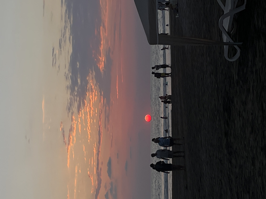 A beach scene at sunset. A vibrant red sun hangs low on the horizon, framed by colorful clouds. Silhouettes of people stand along the shoreline, observing the sunset. The beach extends towards the viewer, darkened by the shadows, while the water reflects the fading light. An overhang or awning is visible in the top right corner.