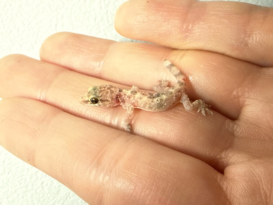 A close-up image depicts a small, light-colored gecko resting on the palm of a human hand