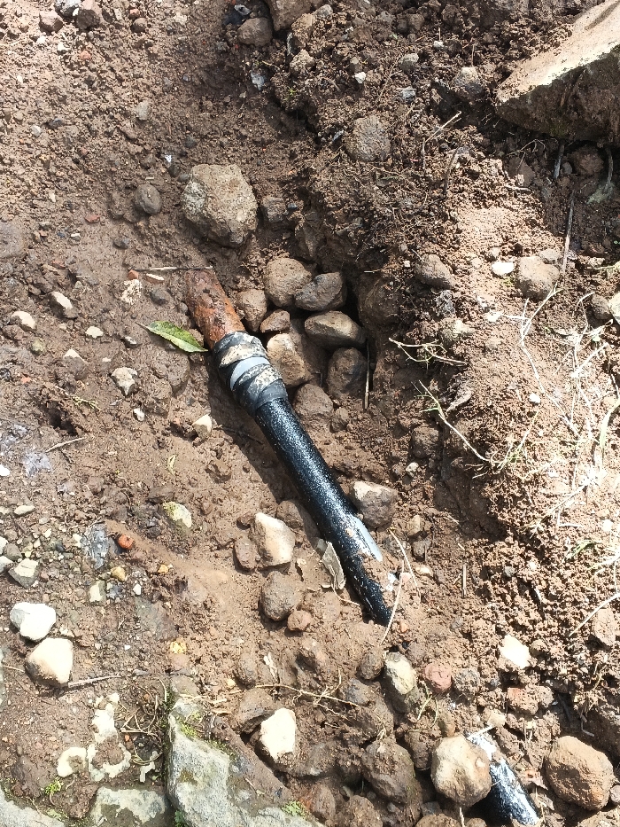 A rusty metal pipe connects to a black plastic pipe using a coupling secured with tape. The pipe lies partially exposed in the dirt, surrounded by small rocks and loose soil. The ground is damp, suggesting recent rain or a leak. The scene appears to be outdoors in a garden or yard area.