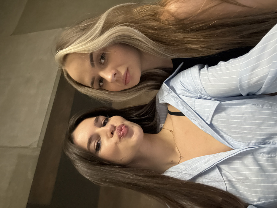 Two young women are close together, taking a selfie. One has long blonde hair with dark roots and a soft, neutral expression. The other has long brown hair and puckered lips, as if giving a kiss. She wears a light blue and white striped button-down shirt with a gold necklace visible. The background is dark and blurry. The image appears to be rotated slightly counter-clockwise.