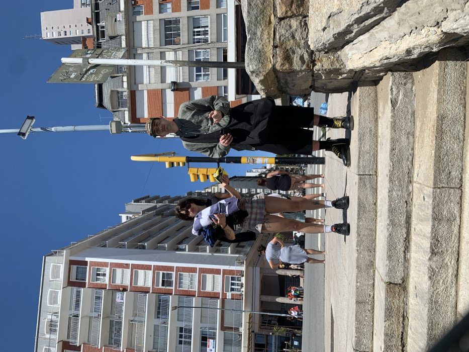 Two people stand near yellow traffic lights on a sunny day. One person wears a gray top and dark shorts with black boots and yellow socks. Another person holds a towel and wears a plaid shirt, dark top and shorts with black shoes. Several other people stand on the sidewalk behind them. Buildings and blue sky form the backdrop. Stone steps are on the right side of the picture.