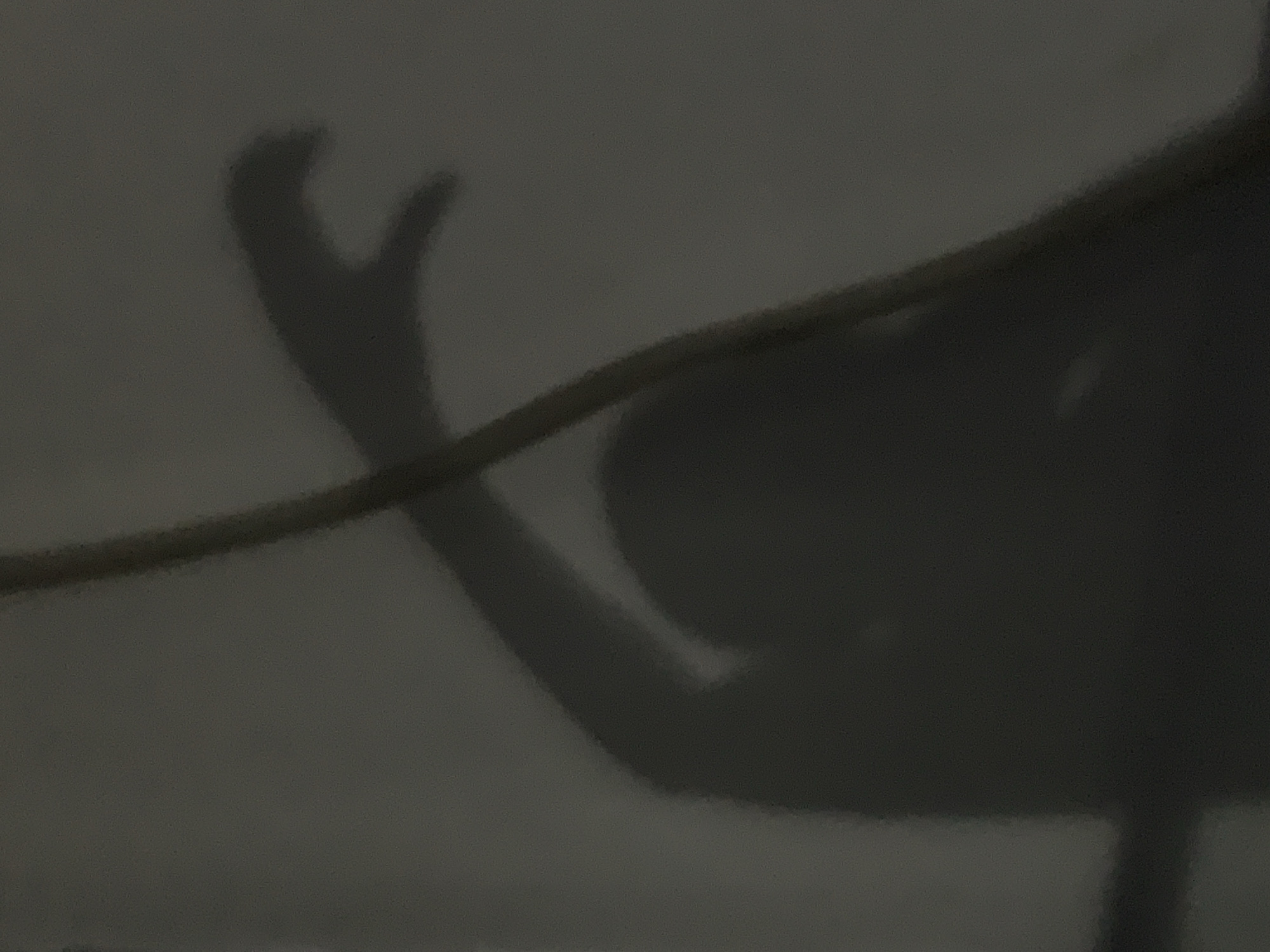 The scene depicts a dimly lit, light-grey wall in the city of Moba, Nigeria. A prominent, dark shadow of a human arm and hand is cast diagonally across the wall, extending from the lower left to the upper right. The hand shadow, located in the upper right quadrant, shows fingers slightly spread and curved, indicating a reaching or grasping posture. A larger, less defined human shadow, likely a torso or head, is partially visible in the lower left portion of the frame, merging with the arm shadow. Overlapping these shadows, a distinct, thin, light-brown linear object, possibly a cable or rope, runs diagonally from the middle-left towards the upper-right, also casting its own shadow. The overall environment appears to be an indoor setting with uniform wall surfacing.