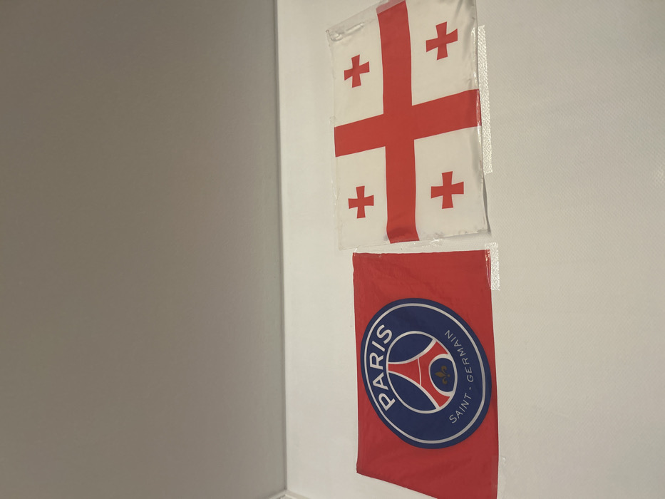 The scene presents two rectangular flags displayed horizontally on a plain white wall. The flag on the left is red and features the circular emblem of Paris Saint-Germain Football Club, detailed in blue, white, and red, depicting the Eiffel Tower, a Fleur-de-lis, and the club's name. To its right, the second flag is the national flag of Georgia, characterized by a white field with a large central red cross and four smaller red Bolnur-Katskhuri crosses in each quadrant. This Georgian flag is partially encased in transparent plastic packaging. Both flags exhibit creasing and are secured to the wall with visible strips of clear adhesive tape along their upper and lower edges. The upper portion of the frame shows a segment of the white wall meeting a white ceiling at a right angle. No individuals, actions, or specific environmental markers are present to identify a location in the city of Metz, France.