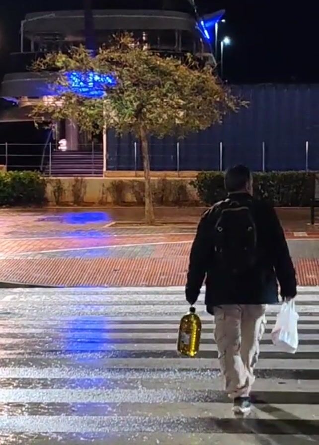 At night, a man wearing a black jacket and light-colored pants with a black backpack is walking across a zebra crossing. He is carrying a large yellow bottle in his left hand and a white bag in his right. In the background, there is a large boat lit with blue lights behind a tree and a low wall. The ground is wet and reflects the blue light. The boat appears to be moored to a dock. The lighting is poor, casting shadows and making the scene dim.