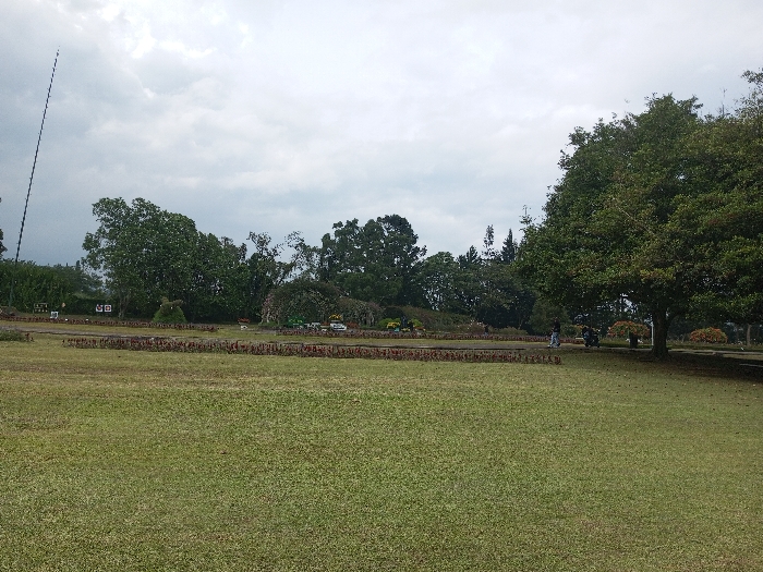 A wide shot reveals a verdant lawn extending towards a row of garden beds and trees. The sky is overcast. A tall, thin structure rises on the left. A large tree dominates the right side of the frame, partially shading a small group of people. The garden beds are bordered with dark edging. The background is filled with various trees and shrubs, creating a dense backdrop.