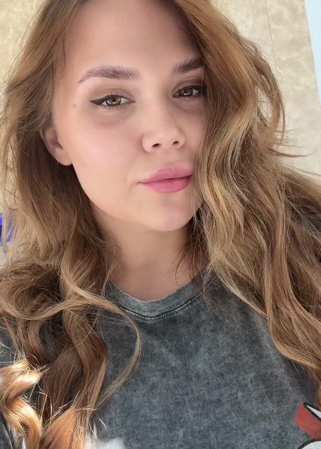 A young woman with long, wavy, light brown hair and fair skin is looking directly at the camera