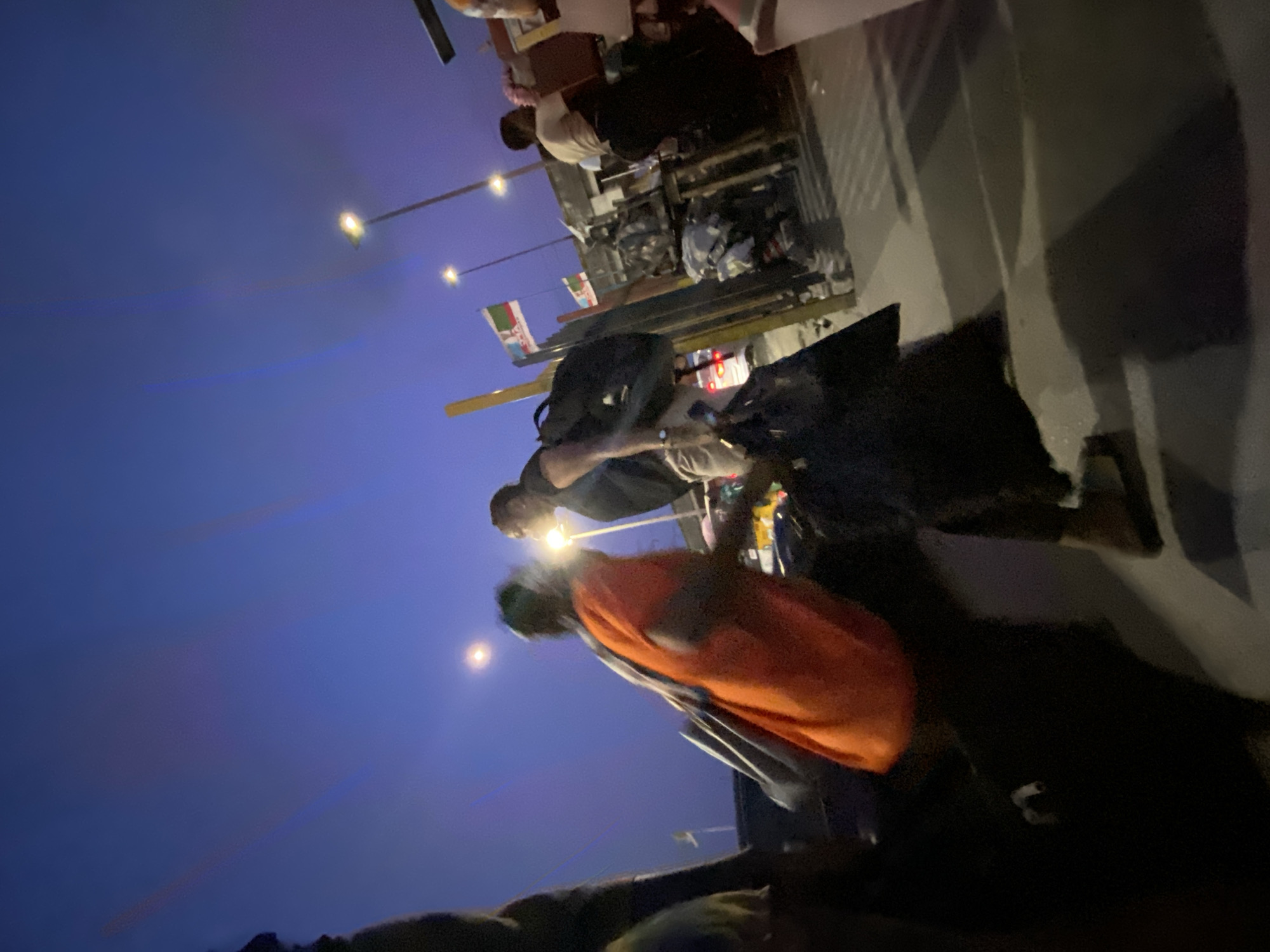 night scene in Lekki, Nigeria. Two people are visible: one in an orange shirt and one in a black shirt. There are tables and chairs suggesting a dining or gathering area. Nigerian flags are visible. Streetlights illuminate the scene.