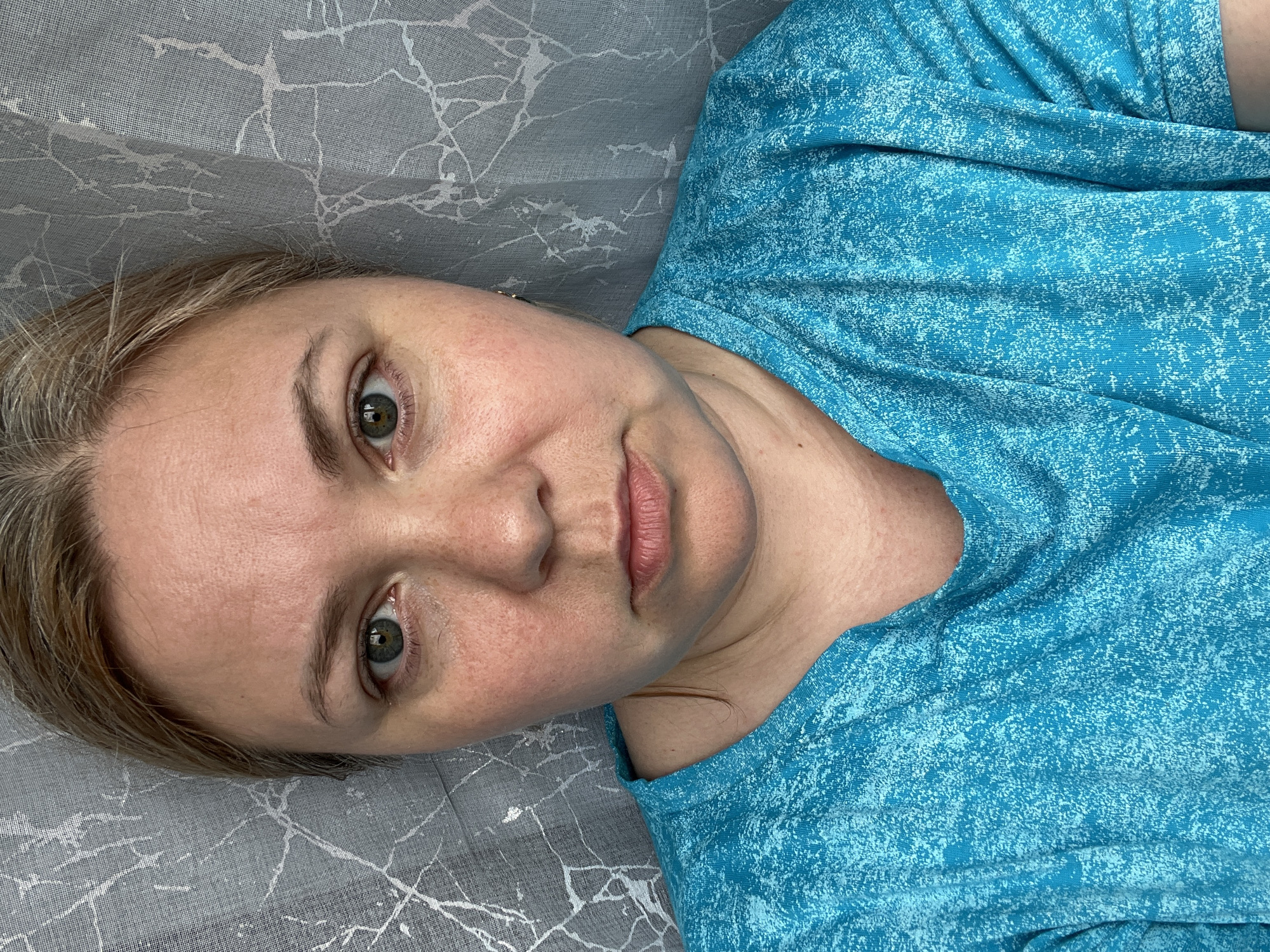 A person with blonde hair and green eyes is lying down, wearing a blue shirt
