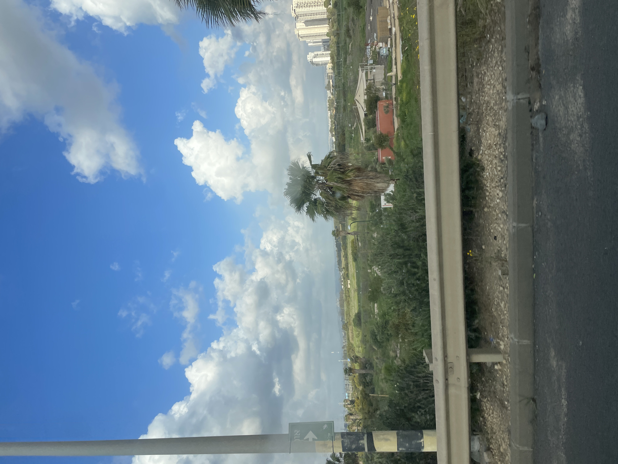 This image depicts an expansive outdoor scene in Petah Tikva, Israel, under a sky characterized by bright blue patches and numerous scattered white cumulus clouds. In the immediate foreground, a strip of dark asphalt pavement is visible at the bottom of the frame, adjacent to a gray concrete curb. Behind the curb lies a gravel shoulder with minimal vegetation. A light beige metal guardrail, consisting of horizontal beams supported by vertical posts, spans the lower-middle section of the image, partially obscuring the view beyond. The midground is dominated by a large area of uncultivated green land, featuring diverse low-lying shrubs, grasses, and several mature palm trees with visible fibrous trunks and dense green fronds. A particularly prominent palm tree stands centrally within this green space. On the far left, a tall, light-colored pole extends vertically, adorned with black and yellow striped markings near its base and a green rectangular directional sign pointing right with Hebrew text. Further into the midground, towards the right, an informal structure with a light-colored fabric canopy is visible, along with two horizontally oriented red shipping containers and scattered debris. In the distant background, a cluster of modern, multi-story residential or commercial buildings with light-colored facades is visible on the right, indicating urban development. Additional indistinct structures, including potential communication towers, are sparsely visible along the distant horizon line. The scene is devoid of observable individuals or active interactions.