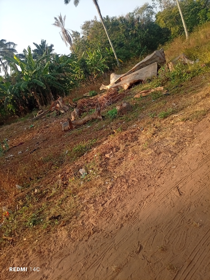 A landscape scene shows a dirt road bordering a hillside scattered with cut logs, stumps, and debris. The hill ascends into a dense area of trees and banana plants. Tall palm trees punctuate the skyline. The ground is dry, with sparse vegetation. The lighting suggests early morning or late afternoon. "REDMI 14C" is visible in the bottom left corner.