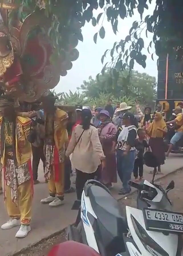 crowded street scene in an outdoor location. A group of people are gathered on the side of the road, some of whom appear to be participating in a cultural performance. Three people dressed in traditional yellow and red costumes are carrying a large, ornately decorated object over their shoulders. In the background, there is a parked motorbike, a food cart labeled "Super," and a large sound system with the word "RPM" on it. Many of the bystanders are watching the procession, and there are several children among them. The sky is overcast, and there are trees and foliage visible in the background.