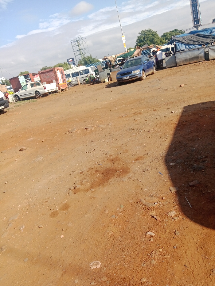 An open, dusty lot contains several vehicles including a white pickup truck and a blue sedan, parked amidst scattered debris. In the background, a white van is visible along with a billboard structure. Some people are gathered near a covered structure. The foreground is dominated by dry, reddish-brown soil with patches of darker stains. Shadows are visible on the right side of the image, adding depth to the scene. The sky is partly cloudy.