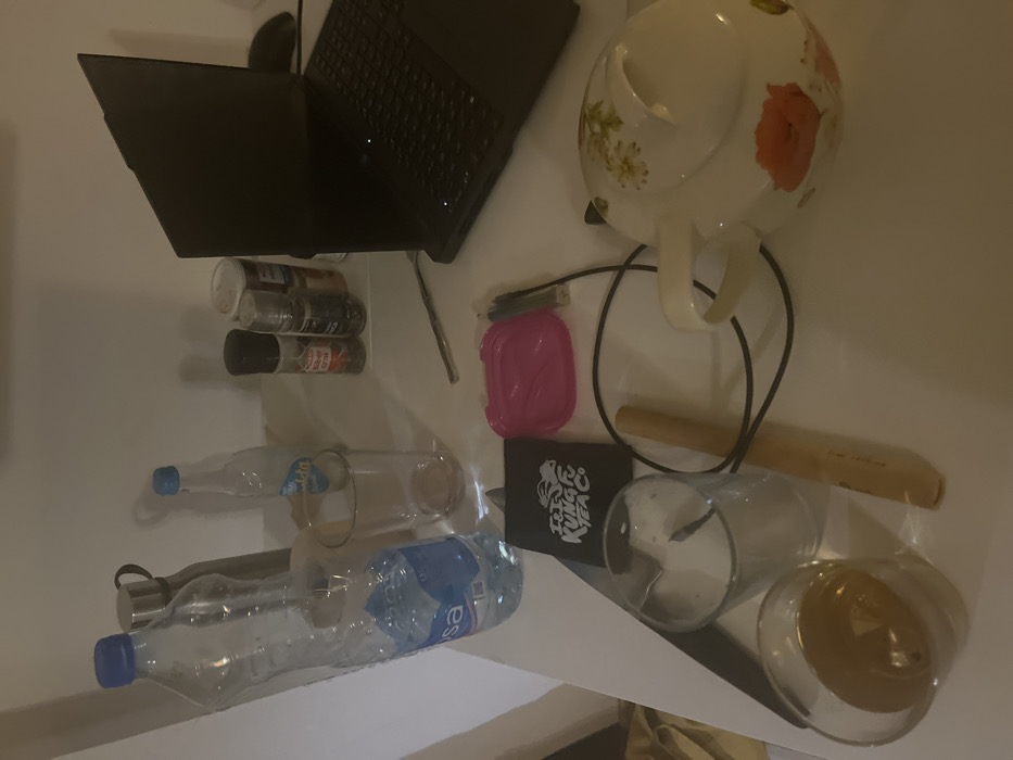 An overhead shot reveals a cluttered white surface with a laptop, a floral teapot, spices, and assorted drinking vessels. Two empty plastic water bottles and a stainless steel one are present. A pink container, a black wallet, and a wooden kitchen tool also occupy the space. Cables and cords are intertwined amidst the items, all arranged in a haphazard manner.
