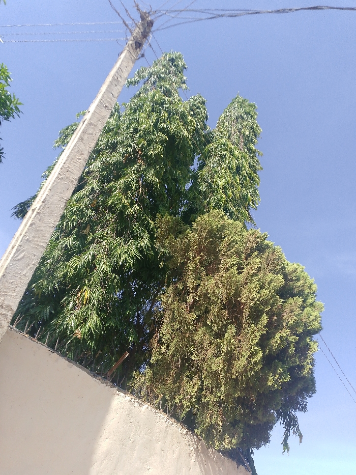 The image displays an upward-angled view of an outdoor scene in what appears to be an urban or semi-urban environment consistent with Jos, Nigeria. In the foreground, a light-colored, possibly off-white, concrete wall angles from the lower left towards the upper center, topped with a row of dark metal spikes or rebar. Behind this wall, several trees are visible. To the left, a tall, light gray concrete utility pole stands, leaning slightly left, with a cluster of dark electrical wires and insulators at its apex. Multiple dark-colored wires extend horizontally from the pole across the upper section of the frame. Behind the utility pole and to its right are two prominent, tall, slender trees with dense, vibrant green, elongated leaves, consistent with Polyalthia longifolia (Ashoka trees). Below and to the right of these taller trees, another tree with a wider, more rounded canopy of lighter green to brownish-green, dense foliage, possibly a type of cypress or juniper, extends upwards from behind the wall. The background is a clear, bright blue sky. No human figures or specific activities are observed.