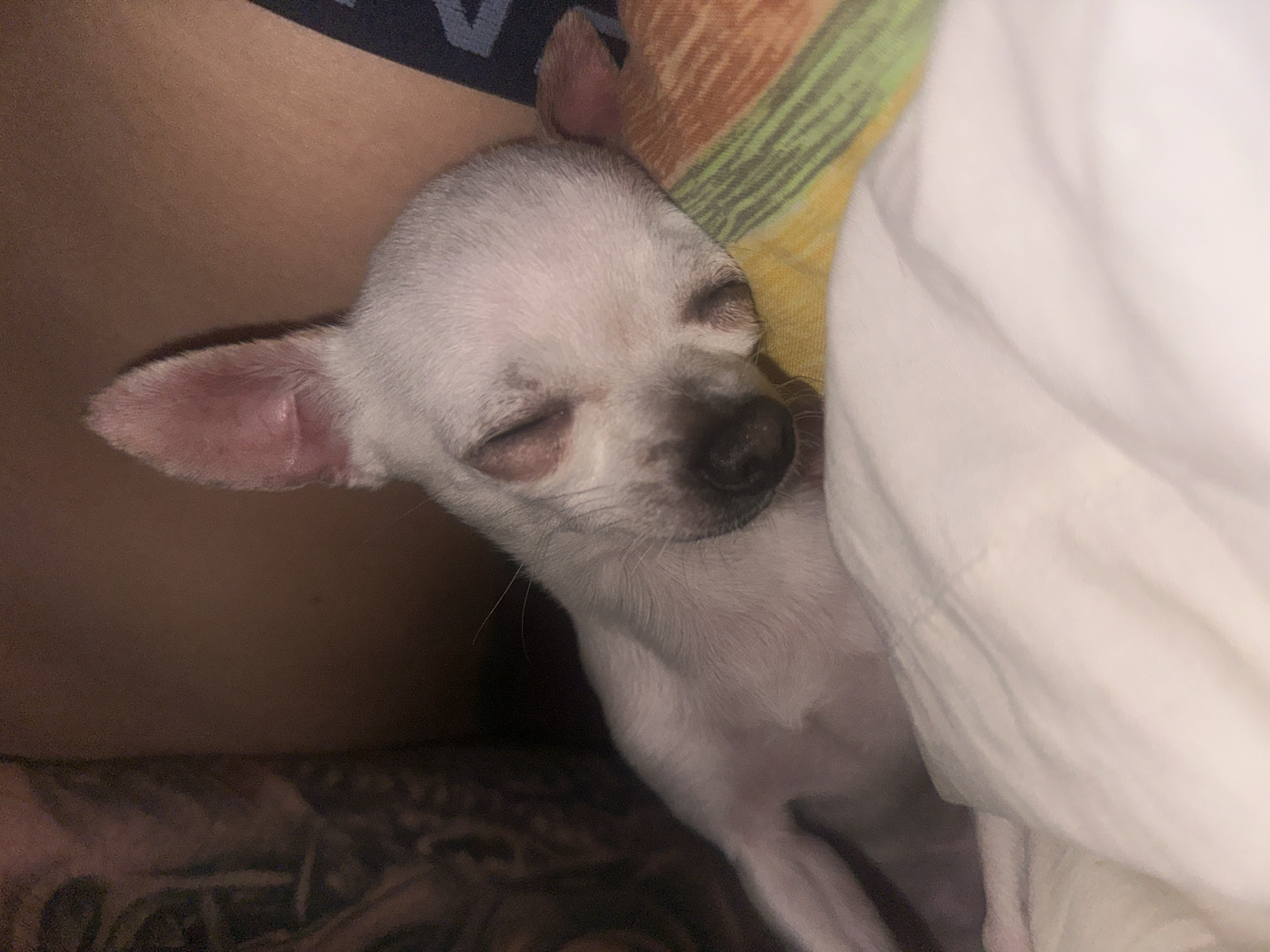 A small, white, short-haired dog is depicted sleeping on a soft surface