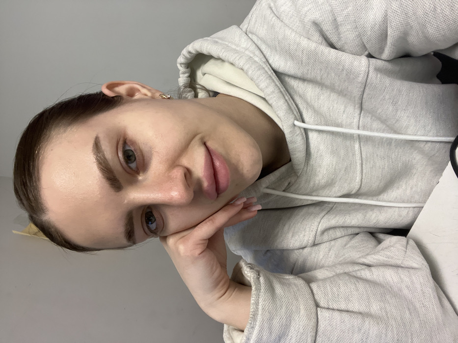A female individual is depicted in a close-up, chest-up portrait, directly facing the camera with a slight smile. She has light skin, dark hair pulled back, light-colored eyes, and well-defined eyebrows. Her lips are full with a pink, slightly glossy appearance. Her left hand is raised, with the palm resting against her jawline and fingers extended towards her cheek, displaying light pink manicured nails. She is wearing a light grey hooded sweatshirt with visible white drawstrings. A small, gold-toned hoop earring is present in her right ear. The background is a plain, light grey wall. A small, irregular light-colored object is partially visible against the wall in the upper right portion of the frame. A white surface, likely a desk or table, is visible in the lower left foreground. The scene is indoors, but no specific urban or geographical markers are present within the image to identify a precise location within Rostov-on-Don, Russia.