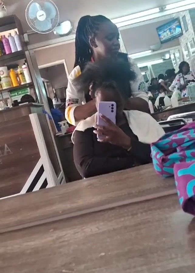 A woman is having her hair done in a salon. She sits in front of a mirror, holding a purple smartphone up and looking at it. Behind her, a woman with braided hair is styling her hair. There's a white towel or cape draped around the seated woman's shoulders. Behind them, in the reflection, more people are visible, likely other customers and staff. Shelves filled with various products line the wall on the left. A fan is mounted on the wall. The countertop in front of the mirror is wood-grained. A blue and purple bag sits on the right side of the frame.