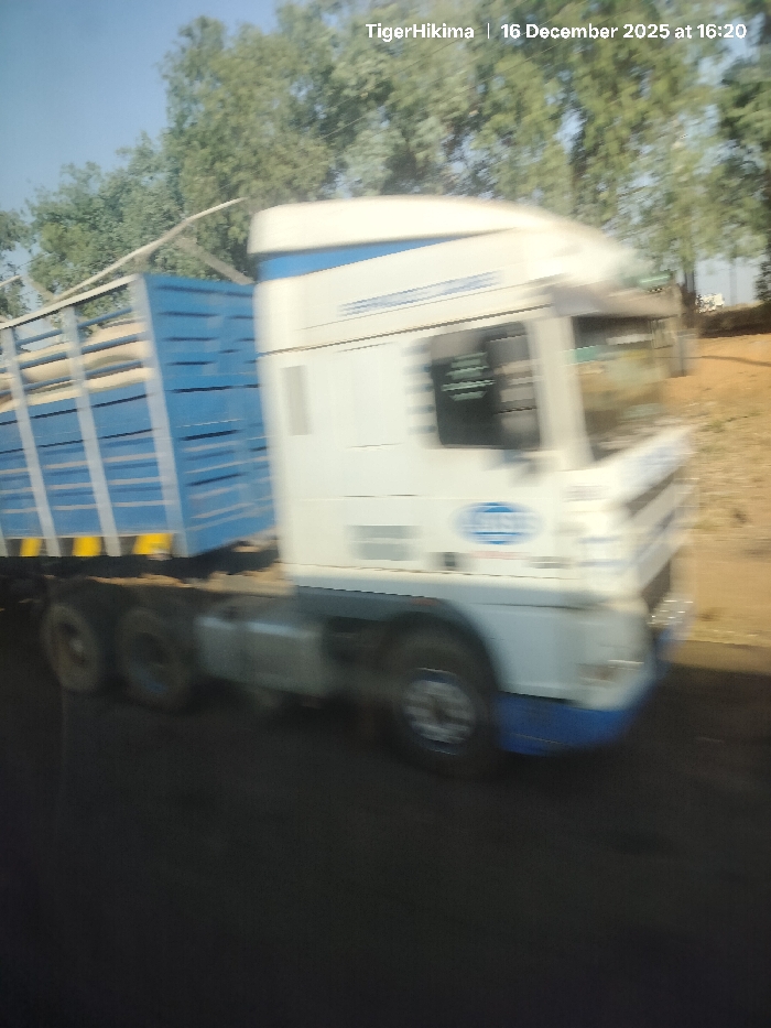 A blurry, medium-shot shows a moving white and blue semi-truck with a blue, cage-like trailer. Trees are visible in the background, indicating a road or highway setting. The image capture includes motion blur, making details indistinct. Text on the top reads "TigerHikima | 16 December 2025 at 16:20".
