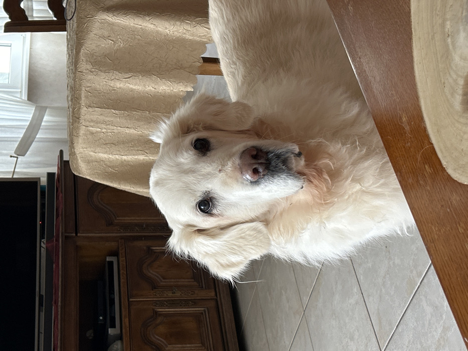 This image presents an indoor scene within a residence in Truchtersheim, France. The central subject is a cream-colored canine, consistent with a Golden Retriever breed, positioned frontally and gazing directly forward. The dog exhibits dark eyes, a dark snout, and a reddish stain on the fur beneath its chin. Its ears are naturally folded downwards. In the immediate foreground, a wooden table surface is visible in the lower right, partially obscuring the dog's body. A light-colored, circular wooden coaster is present on this table. The floor is composed of light-toned square tiles with visible grout lines. The background on the left features a dark brown wooden media console, comprising two cabinet doors and open shelves containing electronic devices. A flat-screen television is situated atop this console. To the right background, a dining table covered with a light brown, textured tablecloth featuring a scalloped edge is visible. Behind this, a wooden chair leg is partially discernible. A window with white curtains is present in the far background, providing ambient illumination. No human subjects are depicted.