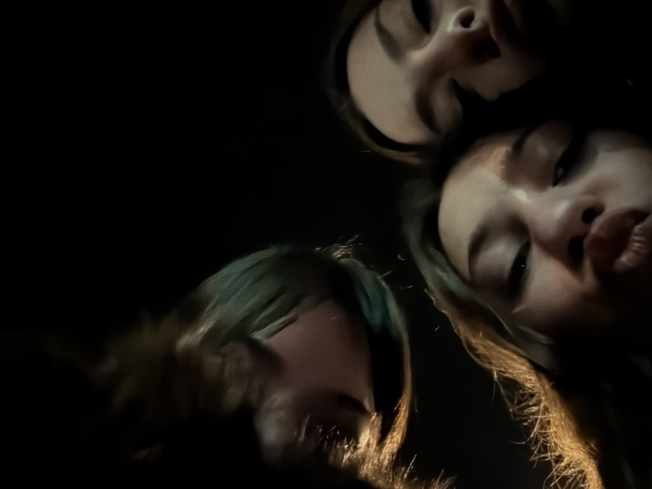 Three young women are closely grouped, their faces filling the frame from a low-angle perspective. The dimly lit conditions create a stark contrast between their features and the surrounding darkness. One woman has light skin and appears to be pouting with her lips. Another has light skin and dark hair. The third individual displays a hint of green in their hair. The overall composition evokes a sense of intimacy and informality.