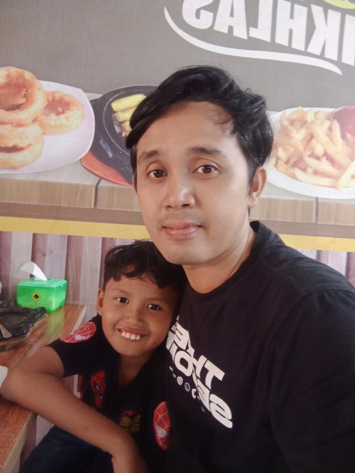 A man and a boy are posing together for a photo. The man has dark hair and is wearing a black t-shirt. The boy is wearing a black Spider-Man t-shirt and smiling. Behind them is a food advertisement featuring onion rings, fries, and another dish. There is a tissue box on the table next to them. They appear to be at a restaurant.