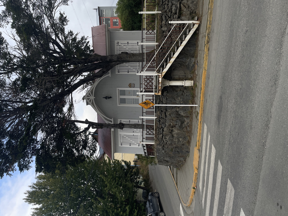A gray house with a red roof sits on a rocky outcrop. A white staircase leads to the front entrance. A yellow pedestrian crossing sign is posted near the base of the rock. A large tree with dense foliage partially obscures the house. A street runs alongside the house with a crosswalk painted on it. Parked cars are visible down the street near other trees. The sky is overcast.