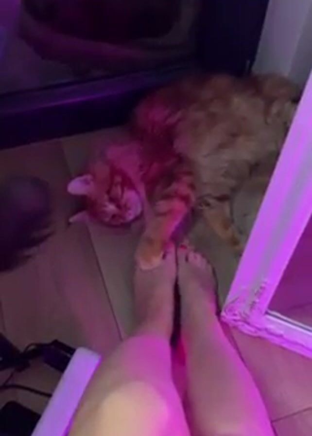 person's legs and feet in the foreground, with red nail polish on the toenails. An orange tabby cat is lying on the floor, partially resting its paws on the person's feet. The cat appears to be sleeping. The floor is light-colored wood. A white-framed mirror is on the right side of the frame. The scene is illuminated with purple light, giving everything a reddish hue. A black object, possibly a power adapter, is on the floor near the person's legs. The video seems to be taken from a first-person perspective, looking down.