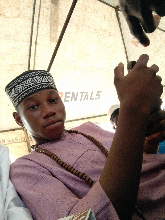 A young man wearing a traditional cap and a light pink shirt with a wooden bead necklace poses for a selfie