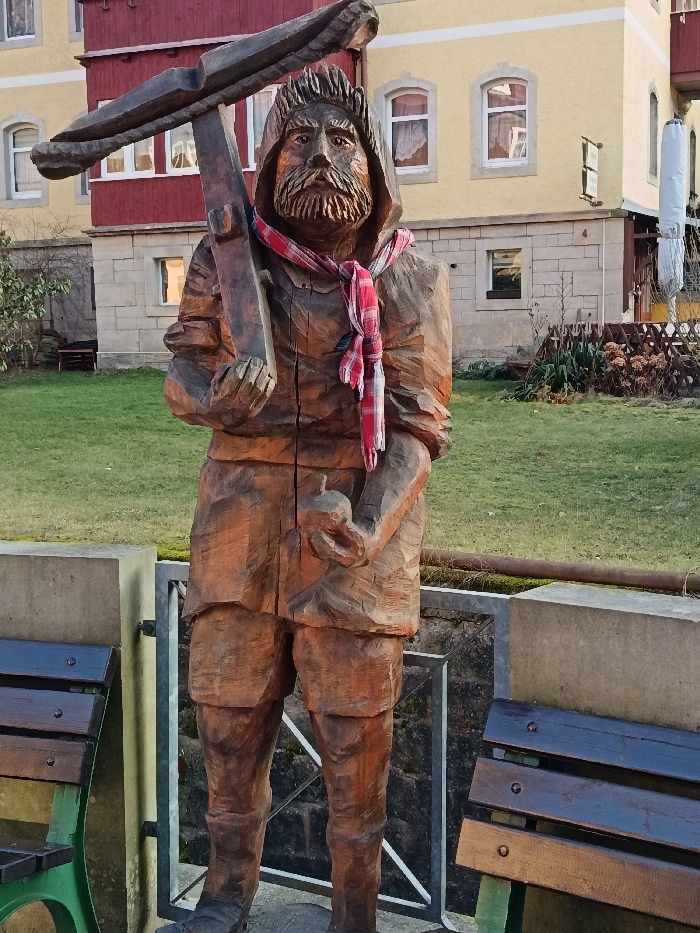 A carved wooden statue of a bearded man stands prominently in an outdoor setting in Rathen, Germany