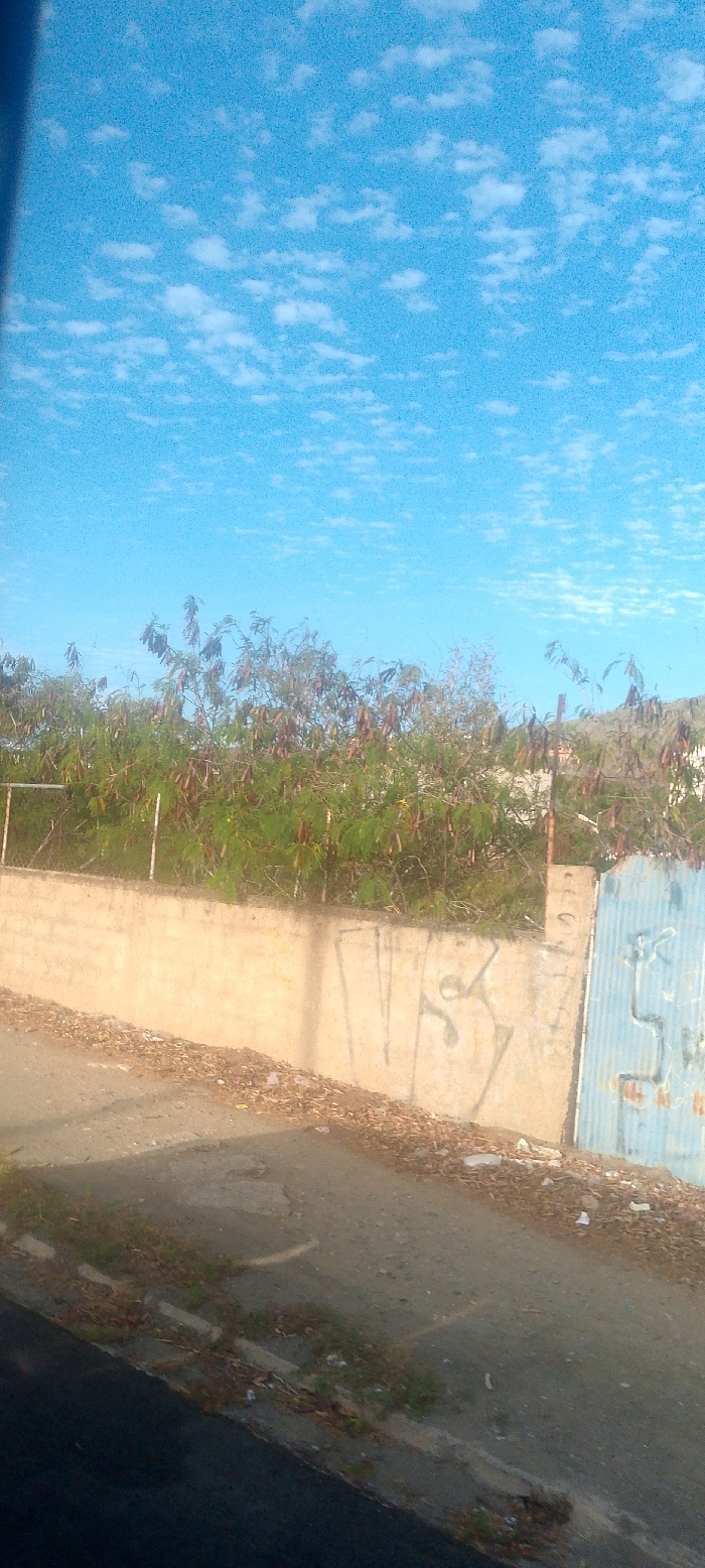 The image presents an outdoor, daytime scene in Santa Ana, Venezuela, captured from a slightly low vantage point. The upper half of the frame features a clear, light blue sky with numerous small, dispersed white cumulus clouds. A dense line of green foliage, characterized by multiple reddish-brown seed pods, occupies the midground directly below the sky. Beneath the vegetation, a light-colored, possibly concrete, retaining wall spans horizontally, exhibiting wear, discoloration, and dark graffiti markings, including a clear "VSS" towards its left side. To the right of this wall, a light blue corrugated metal panel, appearing to be part of a fence or gate, is visible, also bearing indistinct markings. The foreground shows an uneven dirt or unpaved path/road, extensively covered with scattered dry leaves, debris, and some litter. Patches of green grass and weeds are present along the path's edges. No individuals or specific actions are depicted. A dark, undefined object partially obstructs the lower left corner of the frame.