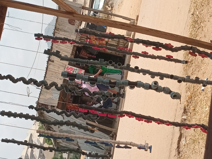 The image captures an outdoor market scene in Dam Camp, Nigeria, under a hazy, light gray sky. In the foreground, multiple vertical strands of assembled PVC plumbing components are suspended from a horizontal wooden beam. These strands consist of various pipes, elbows, tees, couplings, and numerous red quarter-turn ball valves, primarily in dark gray, light gray, and some white or light blue tones, displayed against a backdrop of dry, light brown soil. Behind the plumbing display, a single-story structure, likely a shop or stall, is visible. This structure is constructed from weathered corrugated metal sheets and features a wooden support frame. At least three individuals are present near its entrance. One person, wearing a light-colored shirt, is partially obscured inside. Another, dressed in a dark blue shirt and pants, is seen bending over to the left. A third individual, wearing a bright green top, stands on the right side of the entrance, facing inwards. A partial sign with red capital letters, including "S" and "ABLE," is visible within the stall's opening. In the mid-to-background, multi-story residential buildings are visible on a distant slope to the left. To the far right, a large mountain or hill rises under the hazy conditions. A white vehicle is partially discernible on the far right edge of the frame, behind the stall. The ground throughout the visible area consists of dry, unpaved earth with minimal vegetation.