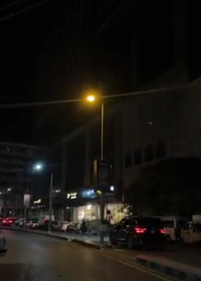 night street scene. Streetlights illuminate parked cars along the curb. Tall buildings loom in the background, one appearing under construction or renovation with scaffolding. One building has shops or restaurants with illuminated signs. The street is asphalt, showing signs of wear.