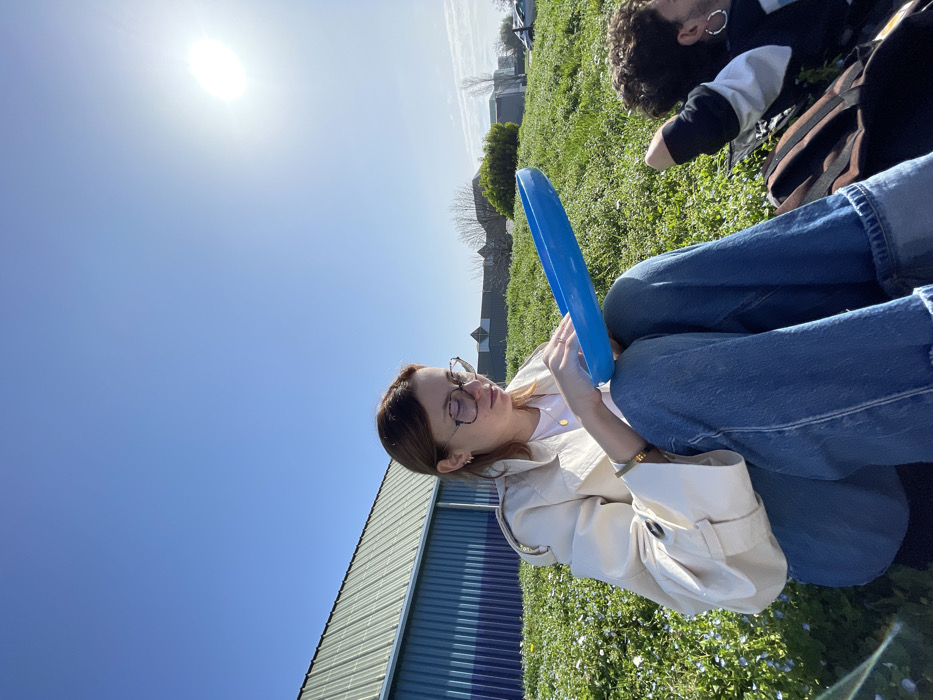 The scene depicts two individuals outdoors on a sunlit grassy slope in the city of Bron, France. In the foreground, a female with reddish-brown hair, wearing patterned eyeglasses, a cream trench coat over a white t-shirt, and blue jeans, is seated. She holds a bright blue, oval-shaped object in her lap, with her fingers positioned on its surface as if interacting with it. To her right and slightly behind, a male with dark, curly hair and a hoop earring in his left ear is partially visible, reclining on the grass next to a dark brown backpack. The background features a building with a light-colored corrugated roof and a blue facade that transitions to a darker blue stripe. Beyond, bare trees and distant vehicles are visible under a clear blue sky, with the sun prominently in the upper right quadrant.